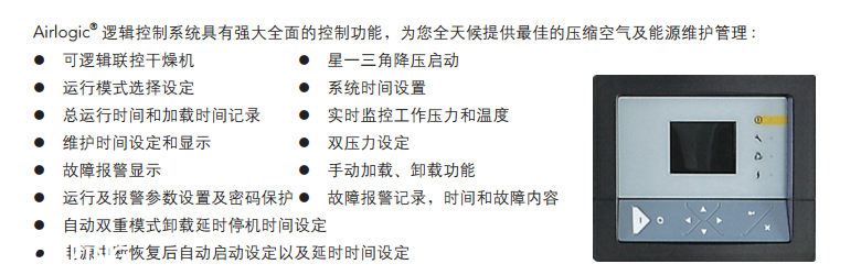Airlogic®邏輯控制系統(tǒng) 昆西QGD/QGV系列標(biāo)配Airlogic®邏輯控制系統(tǒng)。無(wú)論在干燥或潮濕、炎熱或寒冷的環(huán)境中,是您可信賴(lài)的無(wú)故障運(yùn)行的控制平臺(tái)。中文真彩色液晶,界面友好,操作簡(jiǎn)便。 提供多種控制模式的選擇,提高供氣質(zhì)量,運(yùn)行可靠,效率更高?蓪(duì)壓縮機(jī)設(shè)定為本地控制模式、遠(yuǎn)程控制模式和網(wǎng)絡(luò)控制模式。本地控制模式下,壓縮機(jī)加載,如果壓力持續(xù)上升到卸載壓力,壓縮機(jī)進(jìn)入卸載狀態(tài)。在卸載狀態(tài),如果設(shè)定的時(shí)間內(nèi)沒(méi)有負(fù)荷需求,壓縮機(jī)會(huì)進(jìn)入待機(jī)狀態(tài),以節(jié)省能源。直到有新的負(fù)荷需求,壓縮機(jī)再次啟動(dòng)進(jìn)入加載狀態(tài)。在遠(yuǎn)程控制模式下,設(shè)備切換到遠(yuǎn)程進(jìn)行啟停。在網(wǎng)絡(luò)模式下,可實(shí)現(xiàn)多臺(tái)QGD/QGV壓縮機(jī)聯(lián)網(wǎng)運(yùn)行。每臺(tái)壓縮機(jī)根據(jù)負(fù)荷情況自動(dòng)進(jìn)行啟停,加卸載控制,相互配合以實(shí)時(shí)滿(mǎn)足負(fù)荷要求。每臺(tái)壓縮機(jī)按自身的網(wǎng)絡(luò)lD,順序地進(jìn)入或退出網(wǎng)絡(luò),退出即進(jìn)入停機(jī)狀態(tài)。 Airlogic®邏輯控制系統(tǒng)具有強(qiáng)大全面的控制功能,為您全天候提供優(yōu)秀的壓縮空氣及能源維護(hù)管理: