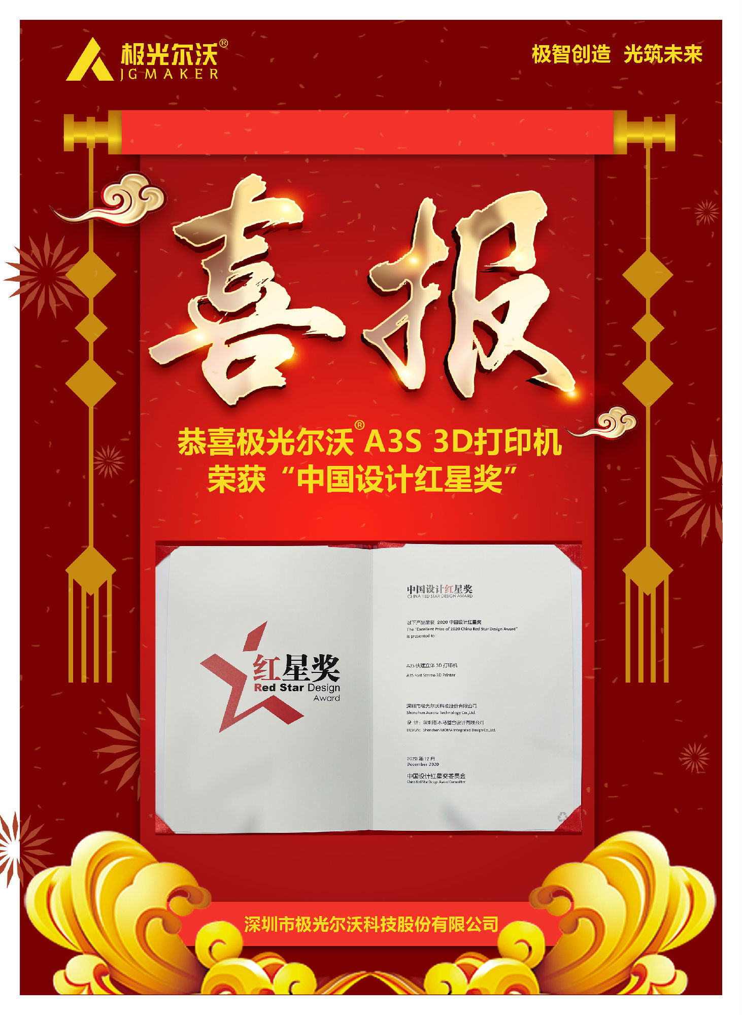 12月9日,2020中國設(shè)計(jì)紅星獎(jiǎng)?lì)C獎(jiǎng)活動在北京舉行。2020年中國設(shè)計(jì)紅星獎(jiǎng)以"融合的時(shí)代 凝聚的力量"為主題,來自全球5000家企業(yè)的7000余件產(chǎn)品參與角逐。極光爾沃A3S 3D打印機(jī)憑借新穎獨(dú)特的設(shè)計(jì)理念、簡潔純粹的產(chǎn)品形象從眾多產(chǎn)品中脫穎而出,獲得評委一致青睞,一舉拿下2020中國設(shè)計(jì)紅星獎(jiǎng)。