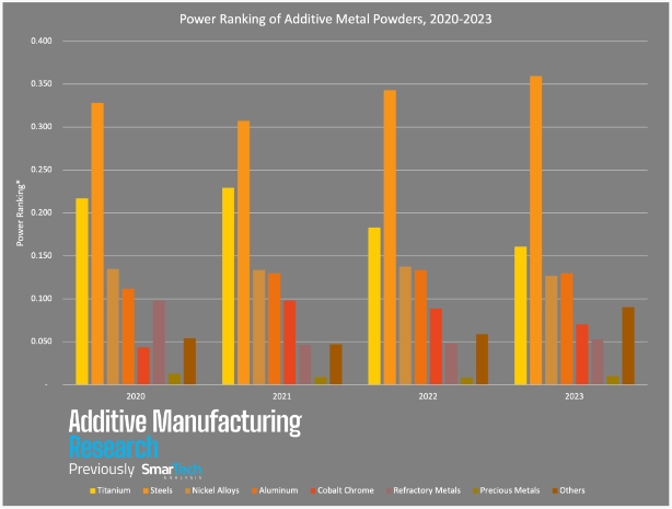 在評(píng)估金屬粉末市場時(shí),平衡增長和銷量等因素非常重要。為了正確比較金屬材料對(duì)整個(gè)3D打印市場的重要性,AMR制定了一套實(shí)力排名的方式,最終將數(shù)據(jù)標(biāo)準(zhǔn)化以進(jìn)行跨年比較。從 AMR 最新的實(shí)力排名圖表中,我們可以發(fā)現(xiàn):